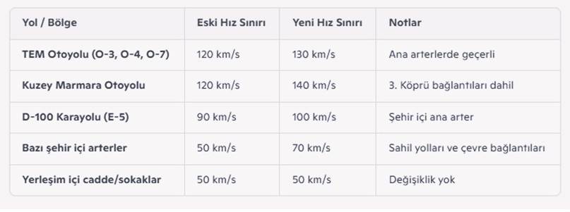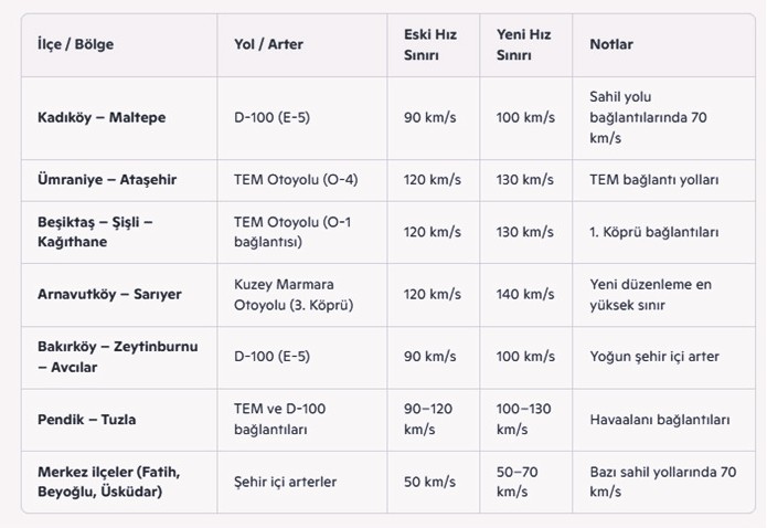 Özetle: İstanbul’da otoyollarda hız sınırları 120’den 130-140 km/s’ye, D-100’de 90’dan 100 km/s’ye çıkarıldı; bazı şehir içi arterlerde ise 70 km/s’ye yükseltildi. Yerleşim içi cadde ve sokaklarda 50 km/s sınırı devam ediyor.