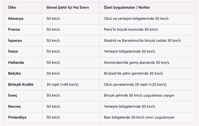Özetle: Avrupa’da şehir içi hız sınırı standart olarak 50 km/s, ancak birçok şehirde güvenlik ve çevre politikaları nedeniyle 30 km/s bölgeler giderek yaygınlaşıyor. (Paris, Brüksel, Amsterdam). Birleşik Krallık biraz farklı: 30 mph (yaklaşık 48 km/s) standart, okul çevrelerinde 20 mph (32 km/s).2030 yol güvenliği hedefleri kapsamında AB, şehir içi hızların daha fazla 30 km/s’ye indirilmesini teşvik ediyor.