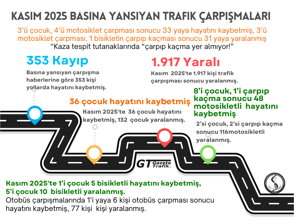 Kasım 2025’te basına yansıyan haberlere göre 353 kişi hayatını kaybetmiş, 1.917 kişi yaralanmış.
